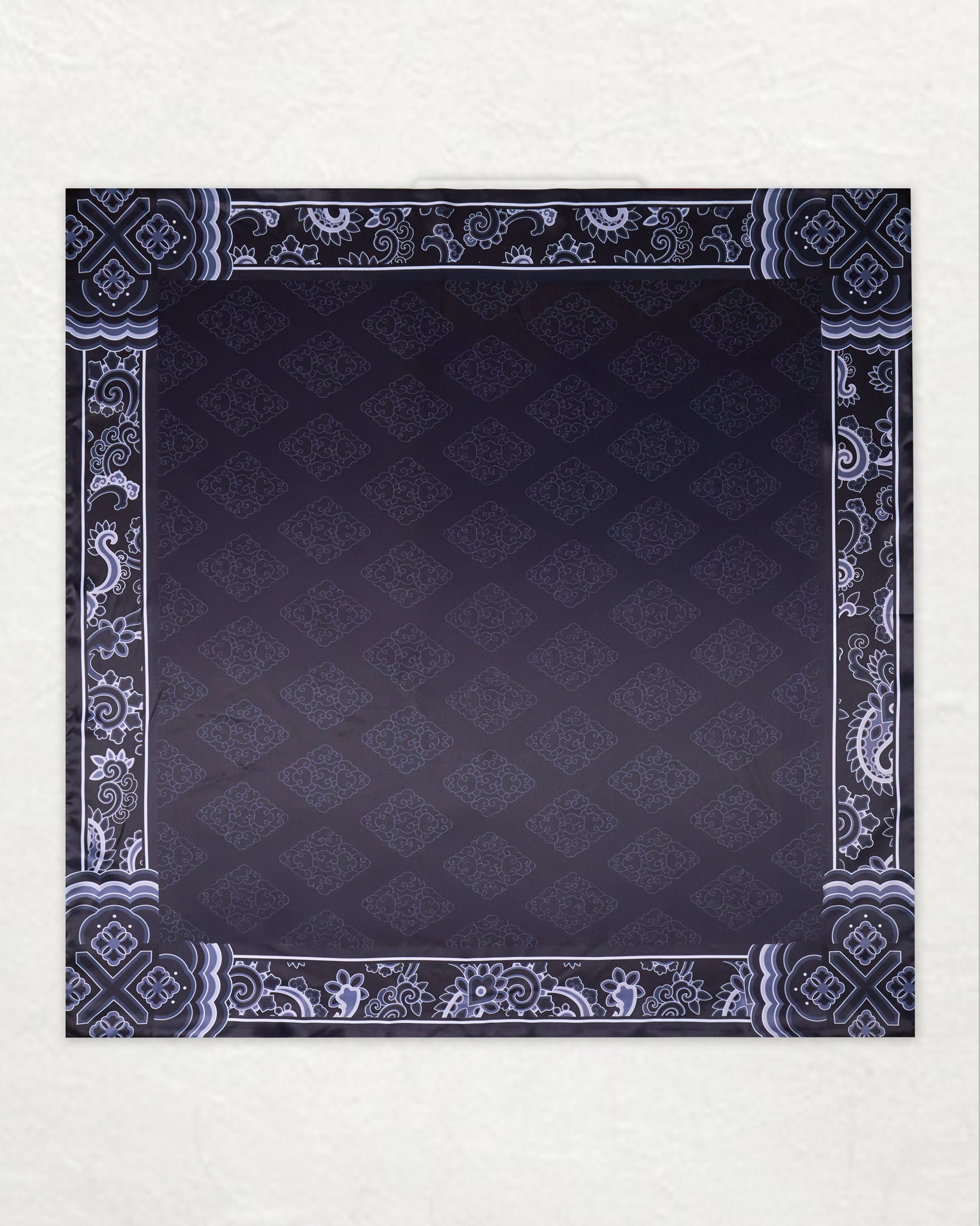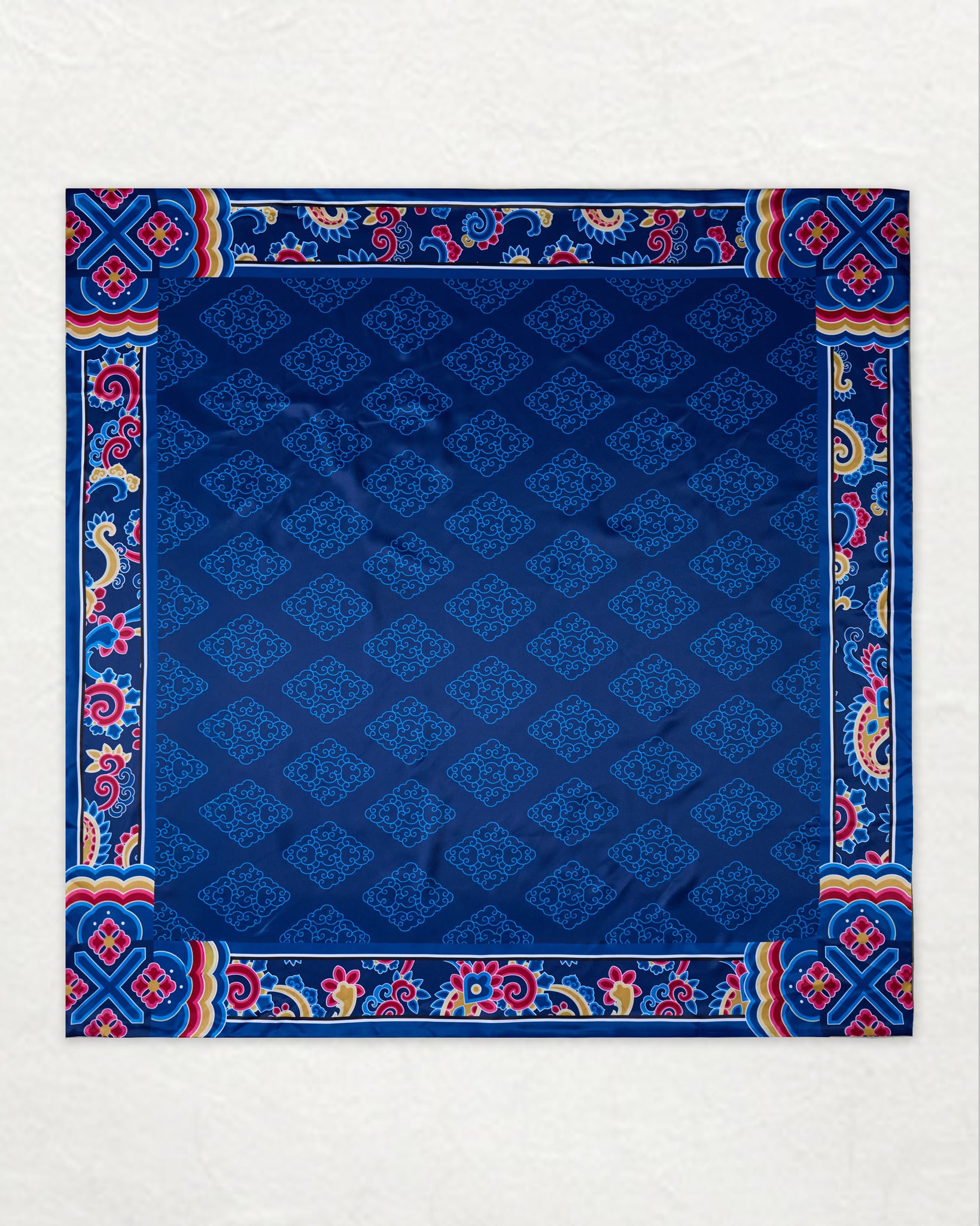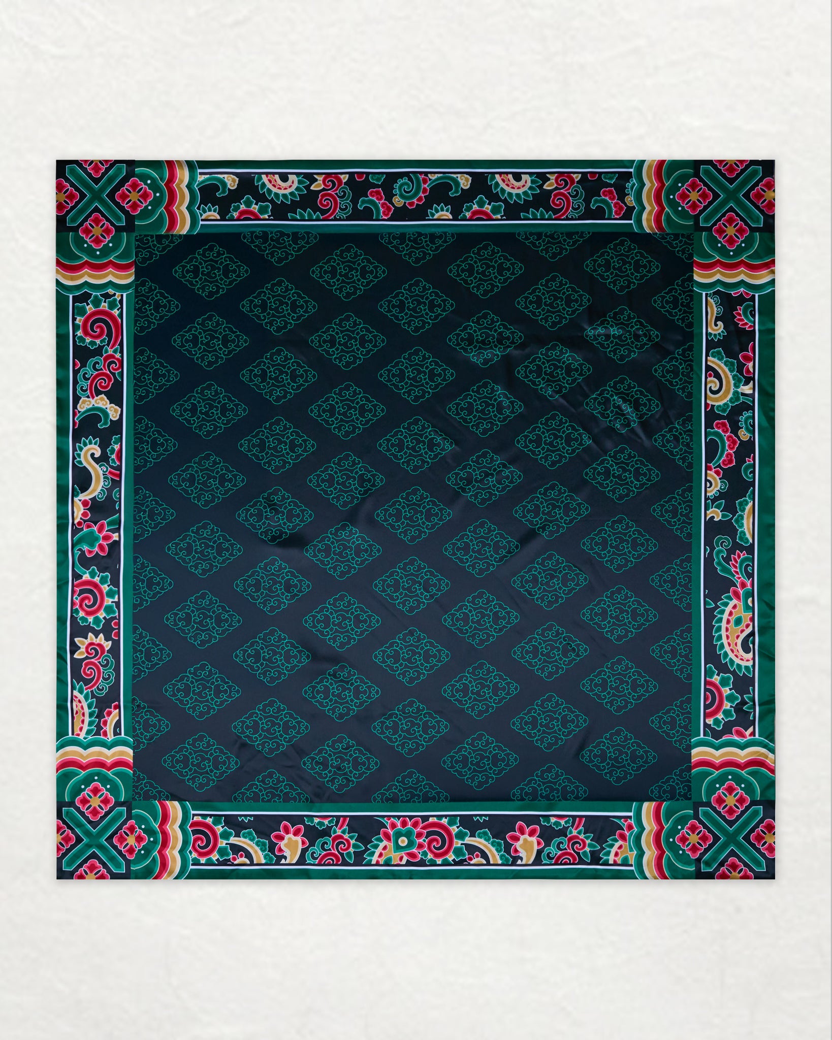 A reversible scarf featuring a modern interpretation of traditional Korean Dancheong art.